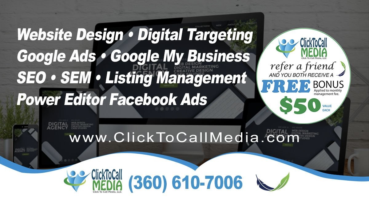 Click To Call Media, a digital advertising/marketing management company located in Bellingham, Washington serves small businesses with optimized websites featuring “visitor personalized content”, SEO, List/Citations Management, Adwords, Facebook Ads, Google My Business & automated customer review systems.